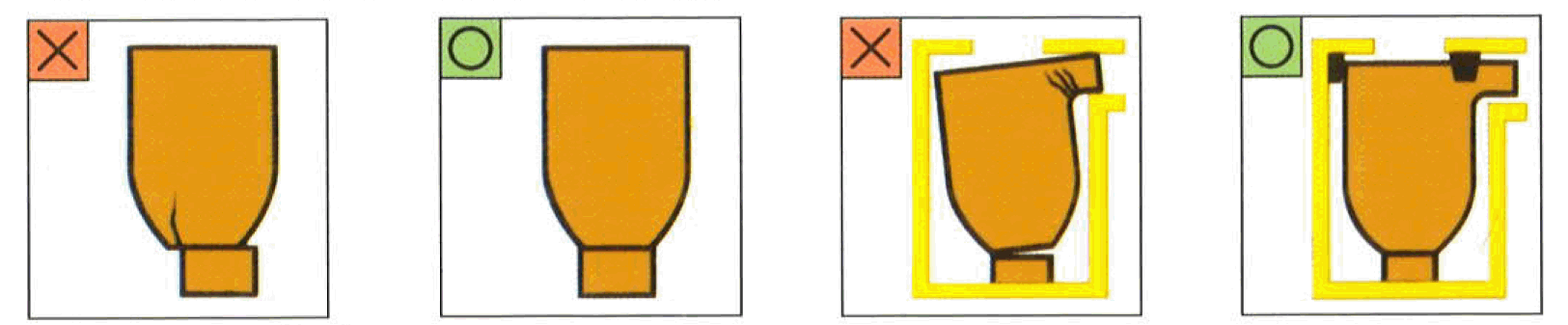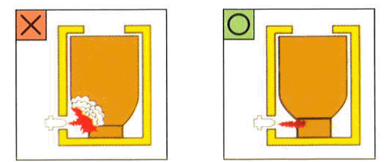 3. การจัดวางเบ้าหลอมโลหะในเตาหลอม : ควรใช้แสตนตั้งเบ้าหลอมที่เหมาะสมกับเบ้าหลอม ไม่ตั้งเอียงไปข้างใดข้างหนึ่ง เพราะอาจเกิดอันตรายต่อผู้ใช้และเบ้าหลอมโลหะได้